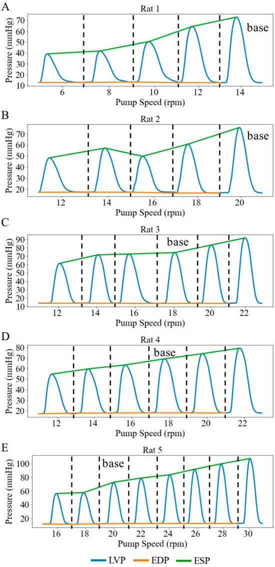 LV pressure waveforms at different pump speeds in 5 cases under retrograde Langendorff constant-flow perfusion condition. (A) Rat 1, (B) Rat 2, (C) Rat 3, (D) Rat 4, (E) Rat 5. Each pressure waveform under different pump speeds is isolated by black dash line.
