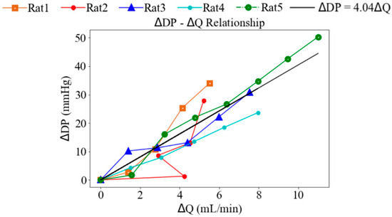 Under Langendorff constant-flow perfusion at baseline (base), the LV end-diastolic pressure (EDP) ranged from 12.30 to 18.07 mmHg with a mean value of 14.65 mmHg, and the LV end-systolic pressure (ESP) ranged from 69.09 to 75.76 mmHg with a mean value of 72.95 mmHg across five rats. These values were within the physiological range. Consequently, the LV DP—that is, the difference between LV ESP and LV EDP—exceeded 60 mmHg (Figure 3). When pump speed was increased by a range of 8 to 14 rpm under the Langendorff constant-flow mode, the mean LV ESP and EDP were improved by 67.13 and 14.75 mmHg, respectively, resulting in an increase in the LV DP of 53.38 mmHg (Figure 3). In addition, aortic blood flow rose to a mean value of 11.01 mL/min. Changes in LV pressure and aortic flow across pump speeds were statistically significant (p < 0.01). Moreover, the increase in LV DP with rising pump speed was positively correlated with the increase in aortic blood flow, with a slope of 4.04 mmHg·min/mL (Figure 4), indicating that enhanced blood flow was associated with stronger ventricular contraction.
