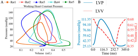 (A) LV pressure–volume loops (PV loops), and (B) representative LV pressure and volume waveforms under working heart constant-pressure mode.