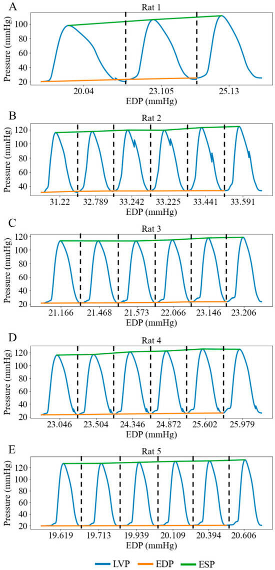 LV pressure waveforms at three different LV preloads in rat 1 and six different LV preloads in rats 2-5 under working heart conditions. LV preload is represented by LV EDP (x-axis). (A) Rat 1, (B) Rat 2, (C) Rat 3, (D) Rat 4, (E) Rat 5. Each pressure waveform under different preloads is isolated by black dash line.
