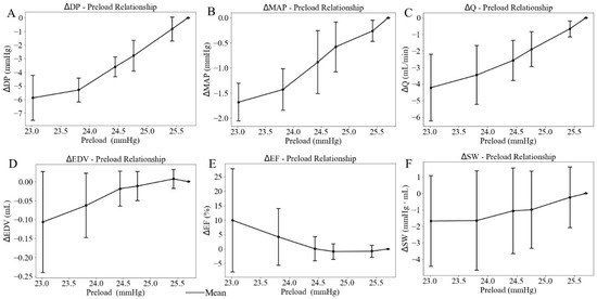 Effects of the LV preload on average value of (A) developed pressure, (B) mean aortic pressure (MAP), (C) flow (Q), (D) end-diastolic volume (EDV), (E) ejection fraction (EF), and (F) stroke work (SW), with standard deviation. In this plot, LV afterload is represented by LV EDP (x-axis).