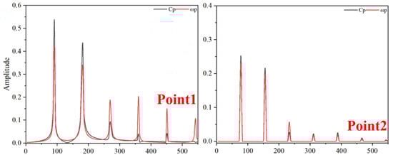 Figure 28, Figure 29 and Figure 30 present the frequency-domain analysis of pressure pulsations and vorticity fluctuations. At points Point1 and Point6, the amplitude of pressure pulsations decreases with an increase in clearance size, while the fluctuation frequency rises. This phenomenon is due to the slowed internal flow and the intensified vortex formation within the larger clearance during stall conditions. The expansion of the clearance contributes to greater vortex instability and accelerated dissipation, thereby softening the impact on the wall and decreasing the amplitude of pressure pulsations. The effects of dissipation and vortex instability also lead to high-frequency components in the pressure pulsations. Conversely, at Point3 and Point4, the primary fluctuation frequency sees a substantial rise of up to 19%. Furthermore, with the increase in clearance size, the core strength of TLV naturally increases, resulting in higher amplitudes of both pressure pulsations and vorticity strength. Additionally, high-frequency components, especially above 300 Hz, significantly increase at points Point3 and Point4. The fluctuation magnitudes at points Point2 and Point5 show minimal change with clearance size, with their amplitude variations staying under 20%. Due to the complex viscous dissipation and turbulent effects in the clearance flow, fluctuation frequencies lack a clear pattern, diverging from the BPF.