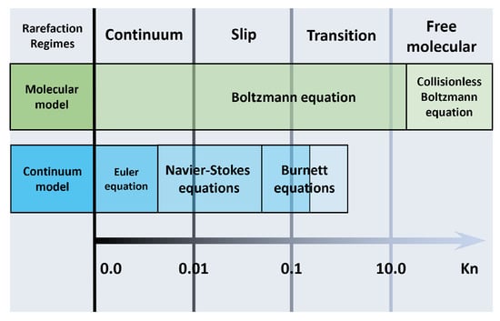 The rarefaction regimes are characterized by the Knudsen number . Figure 1 illustrates the range and the most suitable modeling approaches for each regime.