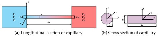 Figure 3 illustrates the considered problem, including the adopted coordinate system and the two types of cross sections studied. The nomenclature to be defined for the variables of the capillary extremities connecting the reservoirs shall henceforth follow the representation defined in it; that is, the pressure, temperature, characteristic dimension, and rarefaction parameter assigned to the left and right extremities are labeled as , , , , and , , , , respectively [24].