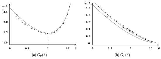 Figure 4a,b illustrate the reduced flow rate of Poiseuille and thermal transpiration flows, respectively, as a function of the rarefaction parameter . It is observed that is minimum at approximately , while monotonically decreases with the increase in . This behavior determines the relevance of the thermal transpiration flow at moderate to low .