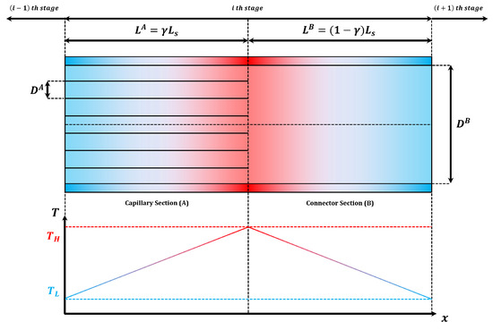 The RFR model will be applied to a multi-capillary Knudsen compressor consisting of several stages , as illustrated in Figure 5. Each stage is composed of a capillary section (A) of length and capillaries of height and a connector section (B) of length and height , where corresponds to the length of a single stage and is the fraction of a single stage capillary section. The wall temperature along x forms a triangular distribution restricted between and [12,31], as shown in Figure 5. The total length of the compressor corresponds to L.