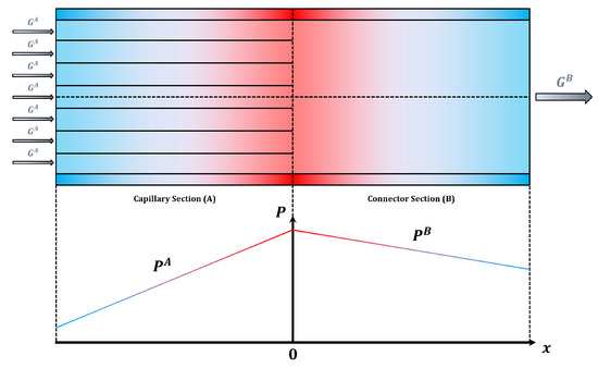 is defined so that the sum of all the capillary heights and of all the walls thicknesses separating each capillary () is equal to the connector section height. Each section of the compressor is solved separately using Equation (3) and considering the linear triangular temperature distribution. Assuming a coordinate system with its origin at a junction of a single arbitrary stage, as illustrated in Figure 6, the set of Equations (5) ensures the pressure and flow rate continuity across the junction.