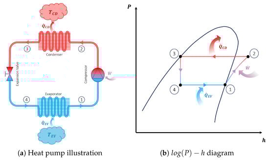 Heat pump cycle and corresponding process steps given in Equation (7). Adapted from [36]. : energy input to the compressor; : mass flow rate of the fluid in the system; and : heat transferred in the evaporator and condenser; and : temperatures of the enclosed spaces on the evaporator and condenser sides, respectively.