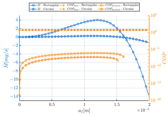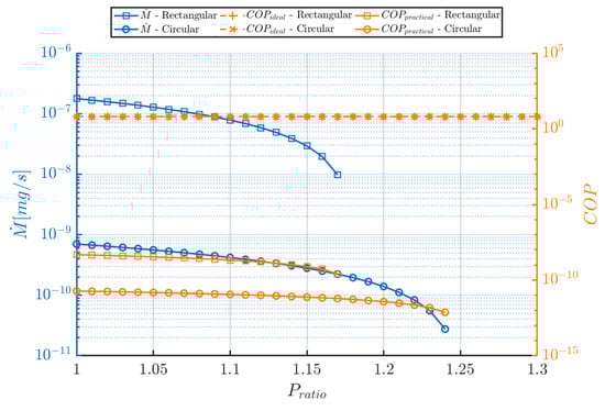 These results suggest that the rectangular geometry is more responsive to the applied enhancements. This is largely attributed to the modification of the parameter, which strongly influences mass flow rate and, consequently, . Since is unique to the rectangular configuration, its optimization led to substantial performance gains not observed in the circular configuration. Therefore, the rectangular Knudsen compressor demonstrates more advantageous characteristics for KHP applications.