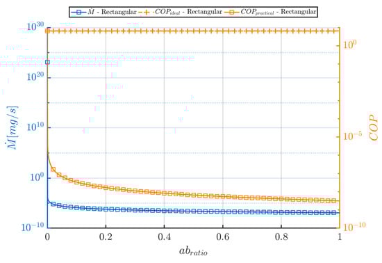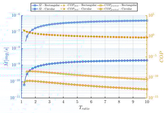 Since the coefficient of performance indicated in Equation (9) takes solely into account the energy required to pump the flow in the system , and does not depend on the heat losses in the Knudsen compressor, a modified parameter that represents the KHP system performance in a more practical manner needs to be introduced into the study. This new parameter shall be denoted as and is expressed by Equation (12). Equation (12) mathematically describes that the performance of the KHP is undesirably affected by the heat losses in the compressor. Following this new parameter, the defined in Equation (9) shall henceforth be labeled the ideal coefficient of performance .