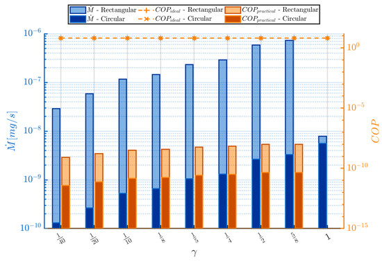 For the rectangular cross section, nearly all performance metrics show marked enhancement. , and as a consequence , and all increase by more than 100%. Additionally, radiative heat loss () is reduced by 98.80%, promoted by the application of silver nanoparticle surface coatings in the Knudsen compressor. Both and improve considerably, with the latter increasing from to 6.006. Conductive heat transfer () is shown to increase by 27.09%, which comes from the cross-section area increase and —mainly influenced by the increase in and . Although an unfavorable outcome, this does not hinder the system’s efficiency, as evidenced by the substantial gain in , indicating an overall improvement in energy conversion performance.