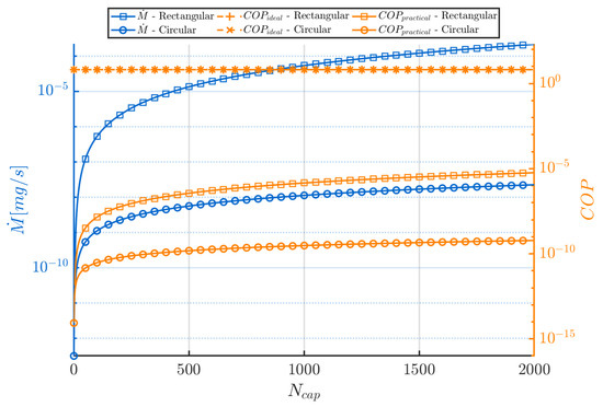 A similar trend is observed for both and , where a continuous decrease is observed with the increase in . Each additional stage increases the number of capillary sections requiring heat input and promotes conductive and radiative heat losses, thereby raising , , and . Since is not affected, this imbalance leads to a reduction in both performance parameters.