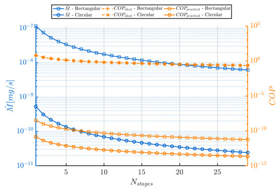 For both geometries, a notable decrease in the mass flow rate , and consequently , is observed with the increase in the number of stages , due to its inverse dependence on the total length of the Knudsen compressor L, which increases with the increase in (refer to Equation (4)).