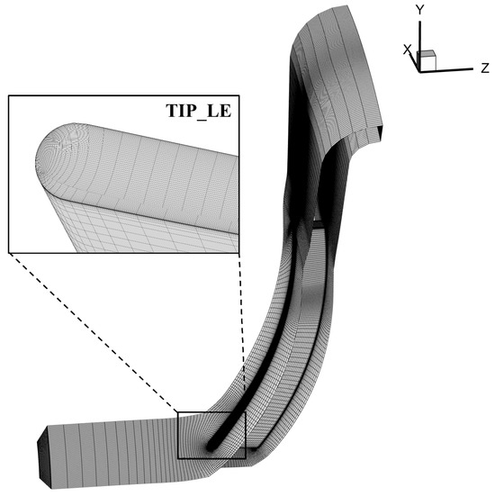 For the steady-state calculation of a three-stage centrifugal compressor, the computational domain is divided into five parts for meshing, as shown in Figure 2. The NUMECA/AutoGrid5 module is used to generate structured grids. The entire passage uses structured grids, and the blade passage is meshed using O4H topology; specifically, the inlet and outlet sections employ H-type grids, the blade area uses O-grid topology, and the tip clearance is meshed with butterfly grids. To ensure simulation accuracy in the boundary layer region, the height of the first-layer grid is set to 1 × 10−6 m, achieving y+ ≈ 1 at the solid walls. Following grid independence verification, the grid distribution in the blade region consists of 97 streamwise nodes, 91 radial nodes (including 20 layers in the tip clearance), and 67 circumferential nodes. The isolated impeller channel model is shown in Figure 3, which is consistent with the three-stage centrifugal compressor model. Specific details of the grid independence verification are provided in Section 3.2.