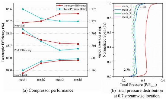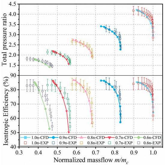 The DDA404-III exhibits inlet Reynolds and Mach numbers similar to those of the model studied in this paper under low-speed conditions. The calculated operating characteristics of the compressor are compared with the experimental results in Figure 4. The mass flow rate is normalized using the blockage flow rate at 1.0 speed. Figure 4 shows that the simulation results are in good agreement with the experimental results at different speeds, with the maximum error less than 5%. After comparing the two sets of experimental data with the simulation data, although some differences exist, the overall consistency is good, confirming the reliability of the numerical method used in this paper.