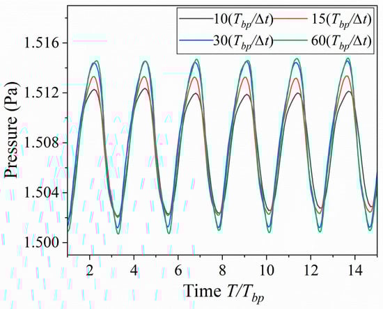 Simulations of a three-stage centrifugal compressor were conducted at the choke point, peak efficiency point, and near-stall point using four different grid scales to eliminate uncertainties arising from grid resolution, as shown in Figure 5a. The grid scales were designated as mesh1 (1.45 million nodes), mesh2 (3.15 million nodes), mesh3 (6.24 million nodes), and mesh4 (11.23 million nodes). It was observed that when the grid size exceeded 6.24 million nodes (mesh3), the overall compressor performance at the choke point, peak efficiency point, and near-stall point exhibited minimal variation. To systematically evaluate the impact of grid size on computational accuracy, the Grid Convergence Index (GCI) method was employed. The total pressure distribution at 10% relative chord length downstream of an isolated blade under near-stall conditions was analyzed to assess the computational accuracy influenced by the grid, as shown in Figure 5b. It was found that, when using the mesh3 grid, the maximum error in the downstream total pressure distribution was concentrated at the blade tip and root, with a maximum error of 3.1%. Considering both computational accuracy and resource consumption, the mesh3 grid, with 1.26 million nodes for the isolated impeller, was selected for subsequent simulations of the isolated impeller. Additionally, four time step sizes are selected, 10, 15, 30, and 60 time steps per blade, as shown in Figure 6. When the number of time steps exceeds 30, the difference in pressure fluctuations at the blade tip is small; therefore, 30 time steps per blade channel are set for subsequent simulations, corresponding to 2.5518 × 10−6 s.