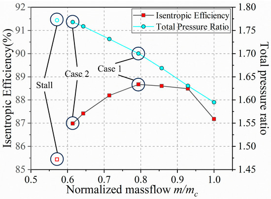 Compressor characteristic map showing total-to-total pressure ratio and isentropic efficiency versus mass flow rate. The investigated operating points, including the best efficiency point (Case 1) and near-stall (Case 2) condition, are marked.