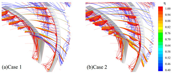Non-dimensional entropy and streamlines on the S3 streamsurface for Case 1 and Case 2.