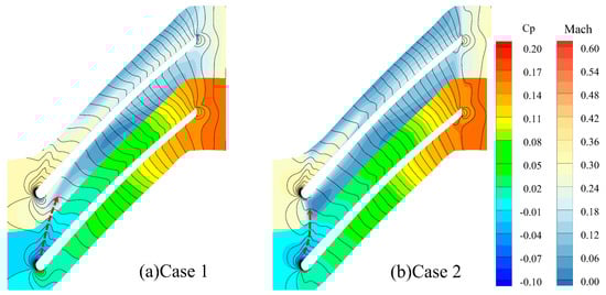 The Mach number and static pressure distribution in the tip region can well observe the shape of the tip leakage flow. In this paper, the pressure coefficient was used to treat the static pressure dimensionlessly:
