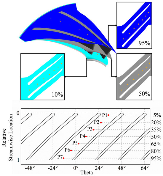 To capture the unsteady characteristics inside the passage, static pressure measuring points were selected at 95%, 50%, and 5% relative blade heights. In the middle of the blade passage, seven measuring points were arranged at each of these radial positions, from the leading edge to the trailing edge, labeled P1 to P7, respectively, as shown in Figure 10.