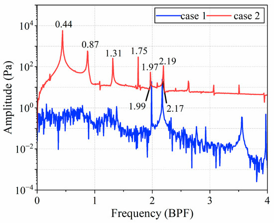 In Figure 11, the static pressure fluctuation curve at the tip position P1 over 30 rotor rotation cycles is presented. Under Case 1 conditions, the amplitude of static pressure fluctuations is observed to be low, with a high frequency. In contrast, under Case 2 conditions, the amplitude in the tip region is significantly increased, with a time interval of 2.3 rotor rotation cycles between adjacent peaks. The static pressure fluctuations from both cases are transformed using Fast Fourier Transform (FFT), as illustrated in Figure 12. For Case 1, the amplitude is found to be small, with dominant frequencies concentrated at 1.99 BPF and 2.17 BPF, attributed to the high-frequency fluctuations of the tip leakage flow induced by turbulence characteristics. For Case 2, the dominant frequency is determined to be 0.44 BPF, with other high-amplitude frequencies primarily consisting of harmonics of 0.44 BPF. These frequency distribution characteristics, exhibiting harmonic multiples, are indicative of interactions among flow structures at the tip position.