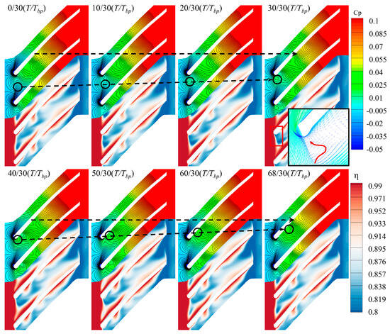 In the upper part of Figure 14, the evolution of the static pressure coefficient within the blade passage over one fluctuation period is illustrated. A thick dotted line is employed to highlight the pressure fluctuations within the blade passage at a specific location. It is observed that, over time, the static pressure contours within the passage exhibit periodic oscillations, consistent with the pressure fluctuations analyzed across the entire blade passage in previous sections. This behavior is attributed to the following mechanism: during one fluctuation period, work is imparted to the airflow by the blade, resulting in an increase in passage internal pressure and a rise in the adverse pressure gradient. Consequently, the tip leakage flow trajectory is shifted forward. Low-energy fluid is accumulated on the pressure surface of the adjacent blade’s leading edge and is spilled into the flow passage. As a result, the blade’s work capacity is reduced, the passage pressure is decreased, and the tip leakage flow is redirected back into the blade passage.
