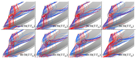 Based on the preceding analysis, the unstable fluctuation structure in the tip region is elucidated. The entire fluctuation period is determined to span (68/30) T, corresponding to a frequency of 0.44 BPF, indicating that the predominant unstable structure within the passage is driven by periodic pressure fluctuations therein. The pressure gradient within the passage is found to induce periodic spillage of the tip leakage flow from the leading edge, resulting in the primary oscillation frequency of 0.44 BPF observed at the leading edge. However, the origins of other high-amplitude frequency fluctuations at the leading edge of the blade tip, such as 0.87 BPF, 1.31 BPF, and additional harmonic frequencies of 0.44 BPF, remain unaccounted for. A three-dimensional streamline diagram of the tip clearance over the entire fluctuation period is presented in Figure 16, where streamlines at the top 10% streamwise position are marked in blue, and those at the 10-20% streamwise position are distinguished in red.