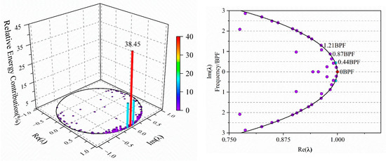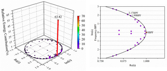 Through DMD analysis of pressure fluctuation data in the rotor’s relative coordinate system across the entire domain, the eigenvalues of the continuous system associated with each mode are obtained, as presented in Figure 17. The color and height of the modes represent the relative energy ratio of each DMD mode, normalized by the total energy of the first 100 modes. A higher relative energy ratio indicates a greater contribution of the corresponding flow structure to the unsteady fluctuations in the flow field. Each mode is characterized by a corresponding frequency. Notably, the high relative energy ratios of the 0.438 BPF mode and its harmonic multiples are observed. The zeroth-order mode, representing the background mode, is found to account for 38.45% of the energy. The first-order mode at 0.438 BPF contributes 26.72% to the energy (encompassing the combined energy ratio of a conjugate mode pair), followed by the second- and third-order modes at 1.315 BPF and 1.753 BPF, with energy ratios of 4.8% and 4.61%, respectively. Furthermore, the eigenvalues of the initial modes are observed to lie on the unit circle (radius = 1), indicating low dynamic damping and decay rates. A comparison between the FFT results and the modal frequencies reveals that the error for the 0.44 BPF mode, which exhibits the maximum amplitude, is determined to be 0.45%, with its harmonic multiples aligning closely with the modal frequencies.