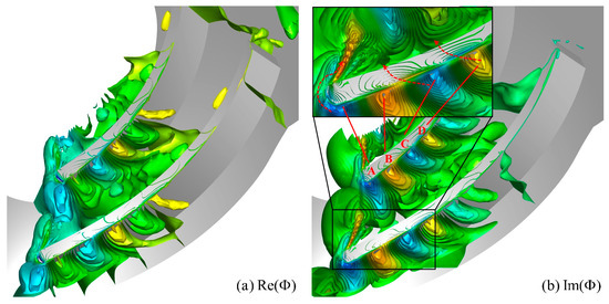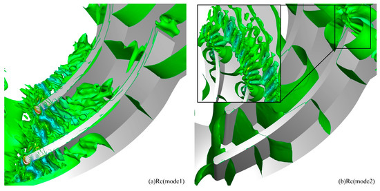 To investigate the spatial evolution characteristics of various modes, the spatial distribution of the real part of the first-order mode under Case 2 is presented in Figure 19a. In the reconstruction of the DMD modal flow field, modes serve as basis vectors, and their spatial distribution is directly indicative of the spatiotemporal evolution characteristics of the corresponding flow structures. The real part of a mode represents the magnitude of static pressure oscillations, while the imaginary part reflects the temporal differences in fluctuations across various spatial locations. The spatial isosurface fluctuations of the first-order pressure mode are analyzed, revealing that significant high-gradient variations are observed on the blade pressure surface side. In contrast, the rear region of the blade passage exhibits larger amplitude but smaller modal gradients.