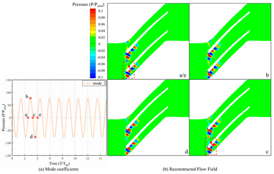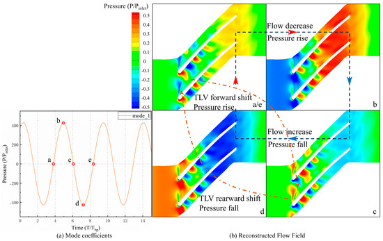 To better elucidate the fluctuation mechanism of mode 1, the modal coefficient fluctuations and the reconstructed pressure flow field of mode 1 are presented in Figure 20. As the DMD modes are normalized during computation, the fluctuations in the modal coefficients are indicative of pressure fluctuations. As illustrated in Figure 20a, mode 1 exhibits pronounced periodic fluctuations with a period of (68/30) T/Tbp, consistent with the fluctuation periods observed in Figure 14 and Figure 16. This indicates that the flow structure corresponding to mode 1 is the primary cause of flow field fluctuations. Five time points (a–e) within one fluctuation cycle are selected, and the pressure field is reconstructed using mode 1, as shown in Figure 20b. It is observed that the entire passage is characterized by a distinct cyclic behavior. At time point a, the pressure at the passage inlet is minimized, reflecting a typical feature of tip leakage flow, accompanied by pronounced alternating high- and low-pressure fluctuations on the pressure surface of the adjacent passage. At time point b, the pressure at the tip leakage flow position is observed to increase, while the pressure at the leading-edge pressure surface of the adjacent blade is reduced, and the pressure in the rear half of the passage is elevated. This is attributed to the low-energy fluid generated by the tip leakage flow entering the passage, causing blockage and reducing flow rate, which leads to a significant pressure rise in the rear half of the passage. At this stage, the tip leakage flow, under the influence of the adverse pressure gradient in the rear, is deflected upstream. In conjunction with the mainstream flow, this results in a pressure increase, reaching a peak at time point c. As the tip leakage flow further blocks the passage inlet, the high-pressure gas within the passage is released through rearward propagation and leading-edge spillage (as shown in Figure 14), alleviating the high-pressure region in the rear half of the passage and gradually reducing the static pressure. At time point d, the pressure in the rear half of the passage is minimized, and the adverse pressure gradient within the passage is reduced. By time point e, the incoming flow and tip leakage flow are redirected back into the blade passage, completing a full fluctuation cycle. It is further observed that a phase lag exists between the pressure fluctuations at the passage inlet (upstream) and the downstream region. When the downstream pressure is elevated and the flow rate is reduced, the passage inlet remains in a low-pressure, high-flow state, with a phase difference of 180°. This suggests that the fluctuations associated with mode 1 represent a holistic oscillation within the passage, with the tip leakage flow serving as a contributing factor rather than the primary structure driving the fluctuations.