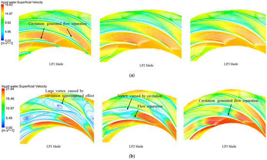 In Figure 17b, when the cavitation number is 0.139, the LP1 blade runner experiences severe flow separation due to intensified cavitation at the low-pressure edge of the blade pressure surface. Moreover, it superimposes the vortex caused by cavitation on the suction surface of the adjacent blade, forming a very large vortex in the downstream blade channel, which seriously hinders the downstream water flow. Cavitation near the low-pressure edge of the LP2 blade runner’s pressure surface causes flow separation. The flow separation caused by cavitation on the suction surface of adjacent blades cannot flow downstream smoothly with the main flow, forming a local vortex. However, the unstable flows caused by cavitation at these two positions do not have a significant superposition effect. A low-velocity zone of liquid water appears on the LP3 blade runner near the low-pressure edge of the blade pressure surface, but it does not affect the mainstream flow in the blade channel.