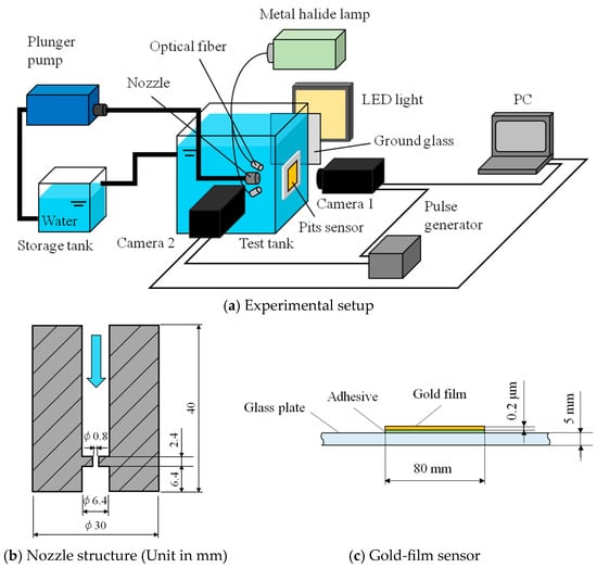 The selection of the pit sensor material depends on the magnitude of the impulsive forces acting on the wall material. Although pit images can be obtained directly from a test model made of aluminum, the pit sensor can be repeatedly used without manufacturing the test model. Another advantage is the observation of the pit distribution from the rear side of the thin film, when the test material is made transparent (see Figure 1a). Figure 1b shows the cavitating-jet nozzle used in the experiment, which consists of a single orifice in the nozzle that promotes the periodic oscillation of the cloud downstream of the nozzle. This experimental arrangement allows the time-series observation of pits using a high-speed camera [73]. An example of experimental arrangements using the gold-film sensor is shown in Figure 1c, which was 0.2 μm thick and pasted on the glass wall. The film sensor was observed using a high-speed camera combined with optical fiber illumination. This configuration of the film sensor allows simultaneous visualization of the pits and cloud structure of the cavitating jet.