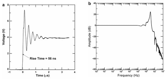 Figure 2 shows a typical example of a PVDF sensor (DT1-028 K/L, Measurement Specialties, St. Marys, PA, USA) and the experimental setup for the cavitation test, in which a cavitation bubble was generated using an electrohydraulic bubble generator set over the PVDF sensors. The PVDF sensor was a film with a thickness of 28 μm and a sensitive area of 12 mm × 30 mm attached to a steel plate [76]. Note that the frequency response of the sensor depends on the film thickness. The PVDF sensor response to a step pressure loading generated by a gas dynamic shock tube (a) and the spectrum analysis (b) are shown in Figure 3. The measured pressure signals were almost independent of the sensors, indicating a uniform sensor output. The average response time of these signals was 56 ns, corresponding to a response frequency of 17.9 MHz, which was high enough to measure the impulsive pressures of cavitation.