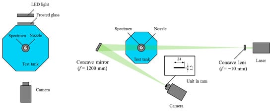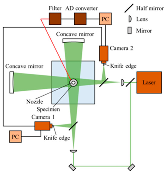 Shockwave formation in a cavitating jet is an important topic of interest because it is closely related to the impulsive pressure generated by the microjet arising from the cloud collapse behavior of the cavitating jet. Shockwaves can be visualized using a laser schlieren imaging system with the optical setup shown in Figure 4 [86]. The experimental setup consisted of a continuous-wave Nd:YAG laser of 5 W, a beam expander, and a concave mirror with a 1200mm focal length. Images were captured using a complementary metal-oxide semiconductor (CMOS) camera with a 200 mm focal length lens, through slit-type dark-field illumination with a 1.5 mm thick. The shutter speed of the camera was set to 250 ns, which is the shortest shutter interval of the high-speed camera. The spatial resolution of the image was 264 × 384 pixels with eight bits at 100,000 Hz.