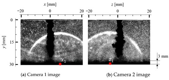 To evaluate the shockwave initiation from the two orthogonal schlieren images, the shockwave was assumed to propagate spherically from the origin near the wall. An example of shockwave images captured synchronously from orthogonal directions is shown in Figure 6. They show shockwaves initiated from a position near the wall. The initiation position of the shockwave is evaluated by fitting a circular trajectory to the shockwave front after thinning the shockwave image. The shockwave initiation coordinates (x, y) can be obtained from the circular curve fitting technique to a set of shockwave images captured by two high-speed cameras.