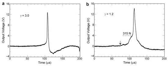 Time response of the PVDF sensor in a cavitation bubble collapse for γ = 3.0 (a) and γ = 1.2 (b). Reprinted from [76]. Copyright (2007), with permission from Elsevier.