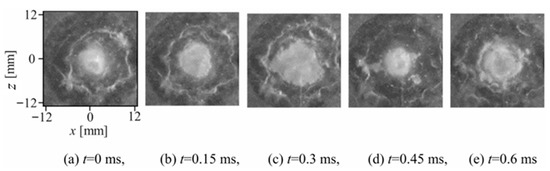 Figure 11 and Figure 12 show the sequential shadowgraph images and corresponding frame-difference analysis images of the cavitating jet impacting the wall [73]. These images were captured using a high-speed camera operating at 100,000 frames when the planar wall was located 30 mm from the nozzle. The shadowgraph images in Figure 11 were taken in the plane perpendicular to the axis of the cavitating jet, resulting in the radial development of the cavitation cloud on the wall, as observed in the images. They showed periodic cloud behavior, and the first three images (a) to (c) were in the growth phase, which was followed by the shrinkage and collapse of the cavitating jet cloud (d). The cloud then spreads in the radial direction (e), similar to that in picture (a). These observations were consistent with the side view of the cavitating free jet shown in Figure 10.