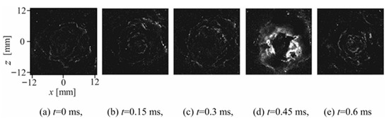 The series of frame difference images in Figure 12 indicates a sudden change in the cloud structure at 0.45 ms (d), which corresponds to the collapse of the cavitation cloud. The cavitation cloud spreads along the wall in the radial direction, and the cloud collapse starts at a distance from the jet center, as observed in the high-intensity area in the frame-difference images in Figure 12d. The intensity magnitude of the frame difference images increases rapidly at the instant of cloud collapse (d), which is clearly observed in the area surrounding the cloud in the outer shear layer of the cavitating jet. This indicates that cloud collapse did not occur along the axis of the cavitating jet, but rather appeared in the outer shear layer. This result agreed with the pit distribution and erosion patterns shown in Figure 7. It should be noted that the cloud behavior of the cavitating jet on the wall was affected by the presence of the wall, which can be seen in the different axial positions of cloud collapse in the cavitating-free jet and cavitating jet on the wall in Figure 11 and Figure 12.