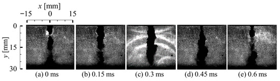 Figure 15 shows examples of laser-schlieren images of the cavitating free-jet issuing into a still water environment at a nozzle pressure of 12 MPa [86]. These images show shockwave formation in the cavitating jet, which occurs at cloud collapse and appears at a distance of approximately 30 to 60 mm from the nozzle exit along the jet centerline. Shockwave formation occurred independent of the presence of the wall. However, the shockwave formation scatters along the jet axis because the free jet is not restricted by the wall. Shockwaves can be generated by the reentrant jet mechanism at the instant of cloud collapse.