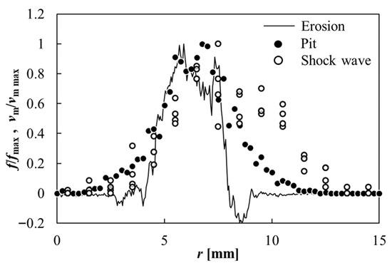 Figure 19 shows the distribution of shockwave initiation positions obtained using the cross-schlieren imaging technique. This distribution was obtained from cross-schlieren imaging at the maximum erosion rate of the cavitating jet at a standoff distance of 30 mm and at a nozzle pressure of 12 MPa. Results were obtained from four repeated experiments with an observation time of 1 s. Subsequently, 800 pairs of shockwave images were analyzed to obtain the shockwave initiation distributions. They are distributed in a circular manner from the jet axis, with a lower density distribution near the jet axis. Furthermore, the shockwave initiation was densely distributed at radial distances within 10 mm of the jet axis. Therefore, the shockwave initiation distribution agrees with the pit distribution shown in Figure 7a. This indicated a similarity between the pit and shockwave initiation distributions over the wall material. Therefore, it is likely that the pits were caused by the microjets generated by the periodic cloud collapse event associated with the reentrant-jet mechanism of the cavitating jet. Shockwave images were not clearly observed at a lower injection pressure of 8 MPa because of the weaker re-entrant jet mechanism of the cavitating jet at low speeds.