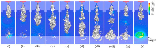 Figure 10 shows an example of the shadowgraph images of cavitating free jets issued into a still water environment captured by a high-speed camera operating at a frame rate of 100,000 Hz. The experiments were performed at 12 MPa nozzle pressure. The time-series shadowgraph images are shown for every 0.1 ms interval, indicating periodic cloud formation every 0.7 ms, which corresponds to the periodic frequency of 1.4 kHz. The series of shadowgraph images showed the formation of clouds within a short distance from the nozzle exit (t = 0 ms), which grew downstream with increasing elapsed time. This was followed by the start of cloud separation near the nozzle (0.6 ms) and shrinkage of the cloud in the cloud image near the nozzle (1.2 ms). Subsequently, a cloud collapse occurred in the image (1.3 ms) at approximately 60 mm from the nozzle exit. Thus, the cavitation cloud experiences periodic growth, shrinkage, and collapse at a short distance from the nozzle exit [73] and is accompanied by unsteady fluctuations in the cloud behavior owing to the influence of turbulence generated in the shear layer. The cloud width increases with the axial distance from the nozzle, and the width reaches a maximum at approximately 50 mm in axial distance before approaching cloud collapse at 60 mm in the cavitating jet. The cloud of the cavitating jet is dispersed further downstream, where the surrounding bubbles are sparsely distributed rather than forming a cloud. It should be noted that the shadowgraph imaging allowed observation of the cloud as well as the dispersed bubbles near the cloud, while the direct imaging captured the blurred reflection light at the cloud interfaces.