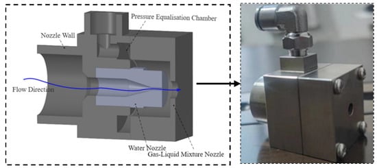 Figure 1 elegantly depicts the structural design of the nozzle, which is composed of two primary elements: the nozzle holder and the nozzle cover. The nozzle holder’s rear end is affixed to the high-pressure water jet generator via a water hose engineered to withstand high pressures to ensure that it can withstand the impact of high-pressure water flow. Within the nozzle holder, a pressure equalization chamber is integrated. When the nozzle cover is secured to the nozzle holder, a slit emerges between this chamber and the cover. Gas is introduced into the pressure equalization chamber through the upper air pipe and, constrained by the downstream slit, is uniformly disseminated throughout the pressure equalization chamber before being evenly expelled through the slit. This innovative design ensures that the gas jet uniformly wraps around the water jet nozzle—even when supplied by a single air pipe—generating an annular airflow effect that reduces the ambient resistance of the water jet in submerged environment.