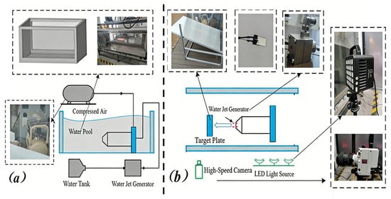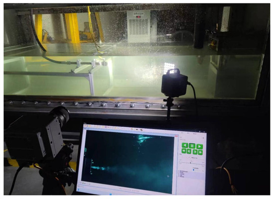 To obtain the evolution law of the water jet flow regime, the initial step taken by this study involved arranging the supercavitating jet generator within the submerged pool, as depicted in Figure 3. Initially, the aperture of the lens was set to a fixed value; subsequently, the focal length of the lens was adjusted and secured. These adjustments were made to ensure adequate light intake and to maintain a consistent depth of field across varying operational conditions.