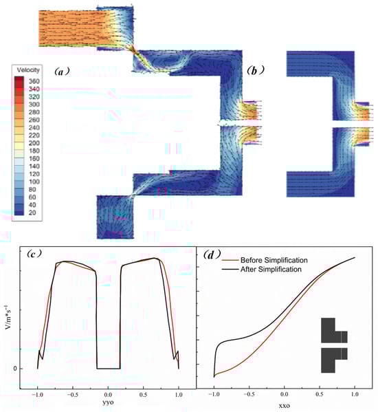 Simplified comparison of nozzle structure modeling: (a) simplified pre-velocity distribution, (b) simplified post-velocity distribution, (c) radial velocity line chart before and after simplification, and (d) axial velocity line chart before and after simplification.