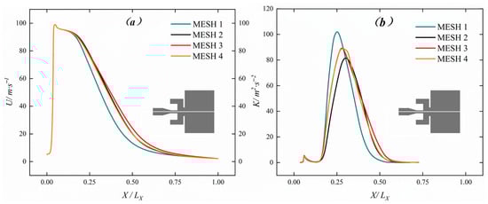 In this study, the physical quantities of interest, encompassing velocity and turbulent kinetic energy, were selected for verification of grid independence on the central axis of the nozzle, as shown in Figure 6. To enhance computational efficiency, the RANS model and an implicit volume two-phase model were employed in this study, which were utilized to conduct steady-state calculations on four distinct geometric models across varying grid densities. Four grid densities were considered: the first grid density (780,678), the second (1,387,879), the third (2,370,919), and the fourth (4,074,966). The coarse grid was derived by thickening the fine grid by a factor of √2 in each direction. At the nozzle outlet, the size of the finest grid was designated to be 0.1 mm.