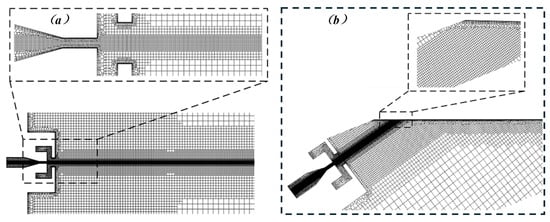 The super-vacuum jet computational domain grid. (a) An unconfined jet; (b) jet impingement on a target plate.