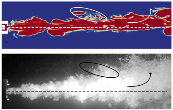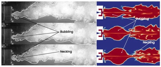 In this study, experimental observations revealed that the cavity on the periphery of the unconstrained supercavitating jet exhibited a phenomenon of necking-bubbling. However, the stochastic nature of the necking-bubbling posed a challenge for its complete replication through numerical simulation. Thus, when numerical calculation simulates this phenomenon, it is considered that the numerical model is set correctly. The difficulty in maintaining stable control over experimental parameters often results in physical experimental observations that may not precisely align with simulation outcomes. Figure 9 illustrates that the numerical simulation had approximated the necking-bubbling phenomenon. However, the amplitude of the necking phenomenon depicted in the figure is relatively minor. It is hypothesized that this discrepancy may arise from the generation of numerous small bubbles due to the intense mixing of gas–liquid at the jet boundary, which obscures the jet’s surface and leads to an inconsistent observation of the necking degree with the actual state. Despite this, the flow regime of the external bubbles was successfully simulated by numerical calculations. Therefore, the numerical model was deemed accurate in this study.
