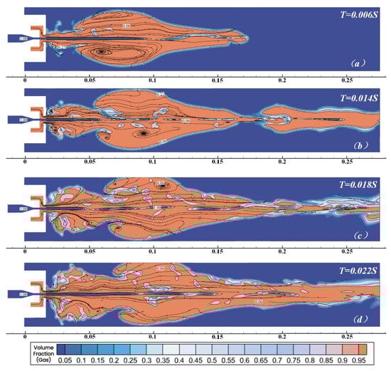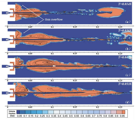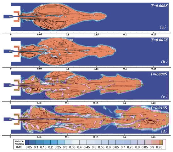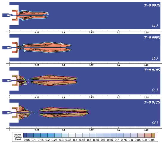 The gas volume fraction of the unconstrained high-gas-supply jet in the initial stage of development. (a) T = 0.006 s; (b) T = 0.007 s; (c) T = 0.009 s; (d) T = 0.013 s.