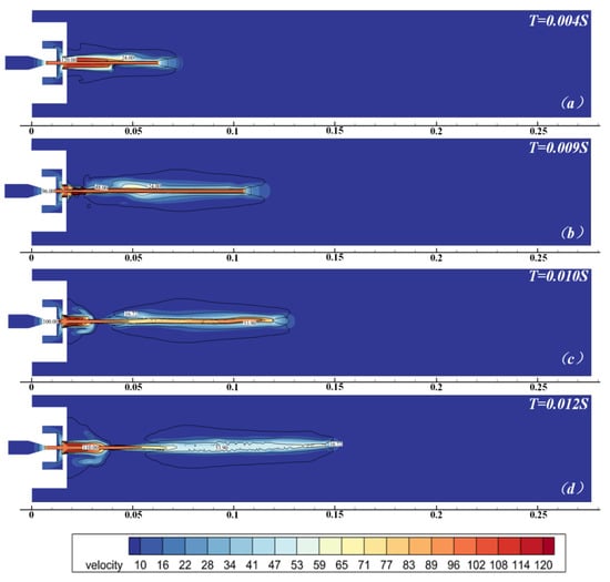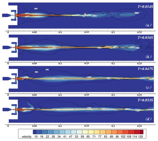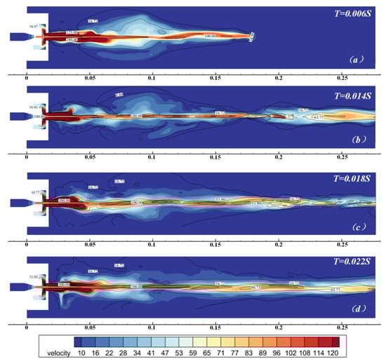 As illustrated in Figure 22, during the subsequent development process, the gas flow rate in the cavity can still reach around 50 m/s. Nevertheless, due to the water jet being broken at the front end and almost no complete and continuous water jet existing at the rear, even if the downstream flow velocity is shown to be relatively high on the velocity cloud map, it is primarily composed of gas and does not possess the expected water jet cleaning effect described in this study.