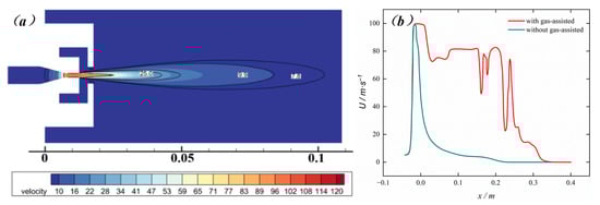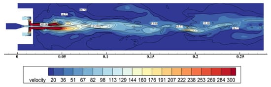 Furthermore, due to the swift velocity of the gas jet, which can reach 300 m/s or even higher, as shown in Figure 22, a larger velocity difference is generated at the interface between the gas jet and the water jet. This difference in velocity renders the surface tension of the core section of the water jet insufficient to resist the force of the external medium, leading to the early occurrence of Kelvin Helmholtz instability. Consequently, this has a negative impact on the jet stability expected in this study.